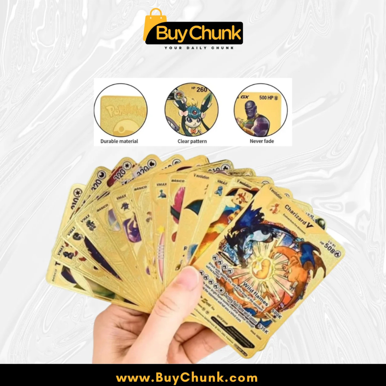 Unlike regular paper cards, these golden foil Pokémon cards are crafted with metallic detailing and scratch-resistant coating, giving them a glossy and durable texture. The gold-plated look adds elegance to every card, making it ideal for serious collectors or those who want something more special than standard trading cards. The set includes a mix of popular Pokémon types to make your collection diverse and exciting.