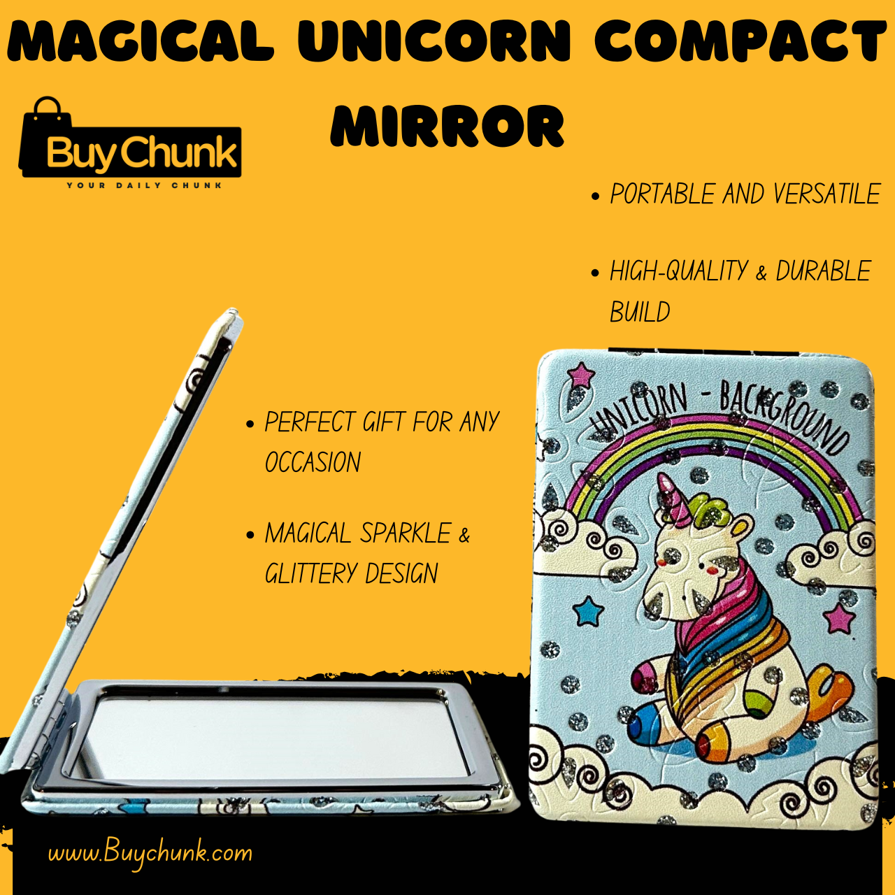 Unlike ordinary mirrors, this one comes with a magical unicorn print and sparkling details that add charm to your daily routine. Its foldable, durable design ensures it lasts, making it as stylish as it is useful.