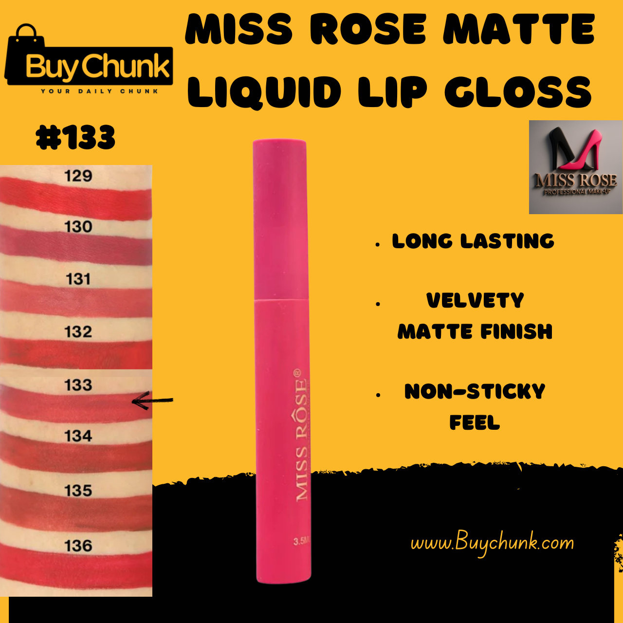 Ready to transform your look with a single swipe? Miss Rose Matte Lip Gloss Shade 133 is your ticket to show-stopping lips every day. Don’t miss out on the shade that Pakistani beauty enthusiasts are raving about – it’s time to make it yours. Shop now on BuyChunk and get it delivered to your doorstep anywhere in Pakistan. Join countless happy customers who have elevated their makeup game with Miss Rose’s unbeatable formula. It’s more than just a lip gloss; it’s a confidence boost in a tube. Go ahead, treat yourself to this must-have beauty essential and add to cart today for a glam experience you’ll love. Your perfect pout awaits – order now and let your lips do the talking!